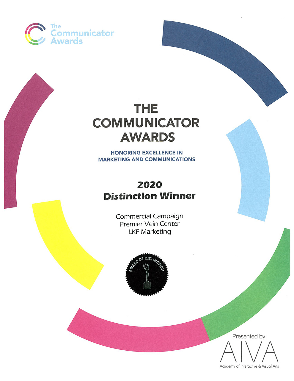• The Communicator Award certificate awarded to LKF Marketing for the Premier Vein Center commercials.