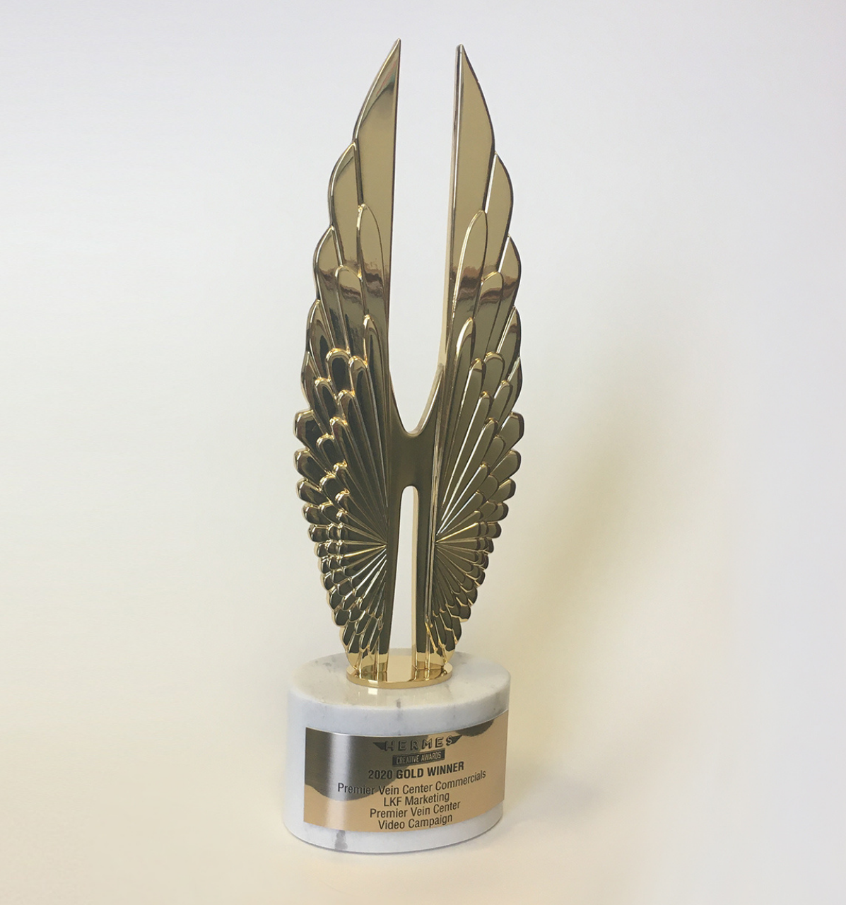 • An image of Hermes Award statuette awarded to LKF Marketing for the Premier Vein Center commercials.