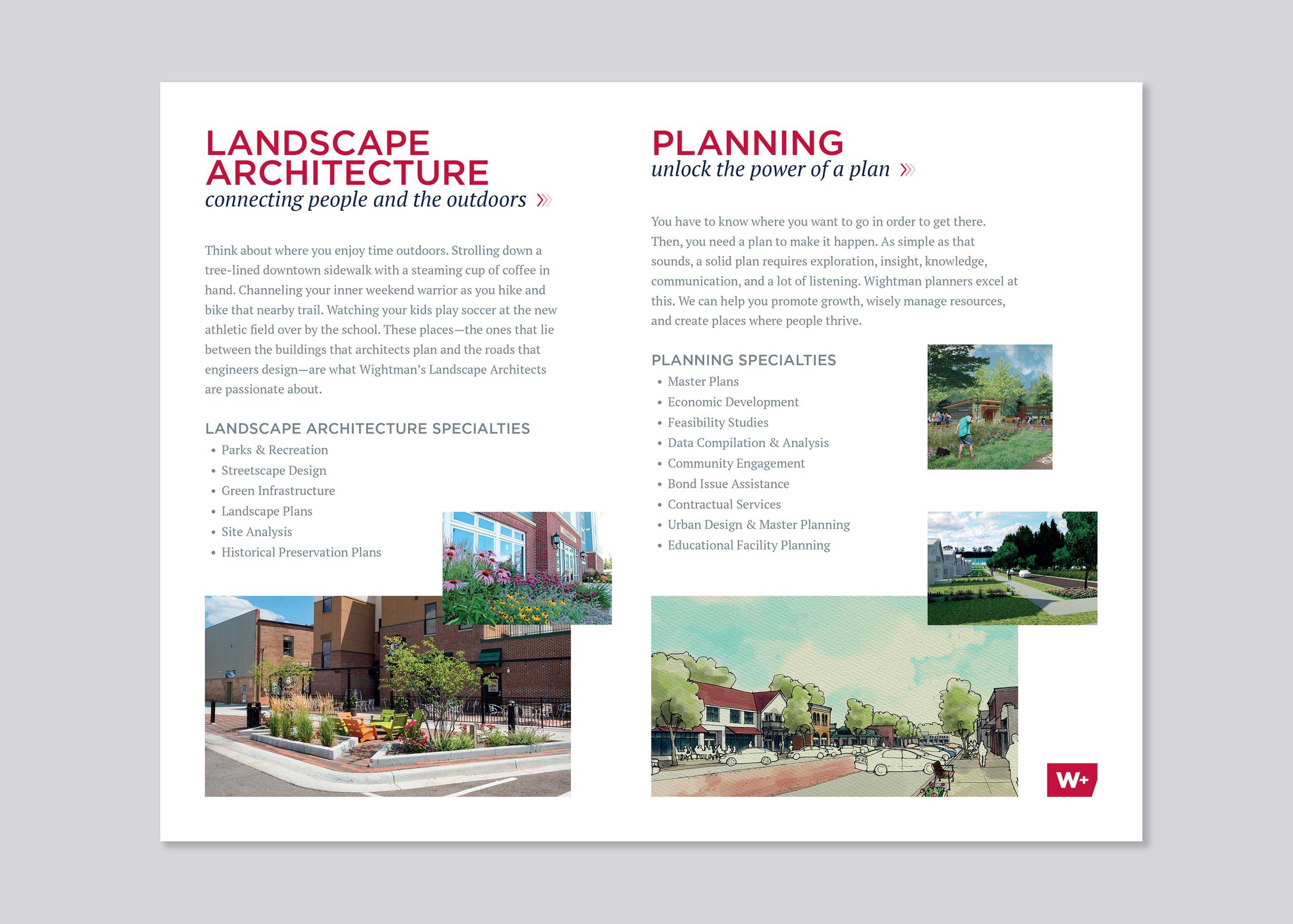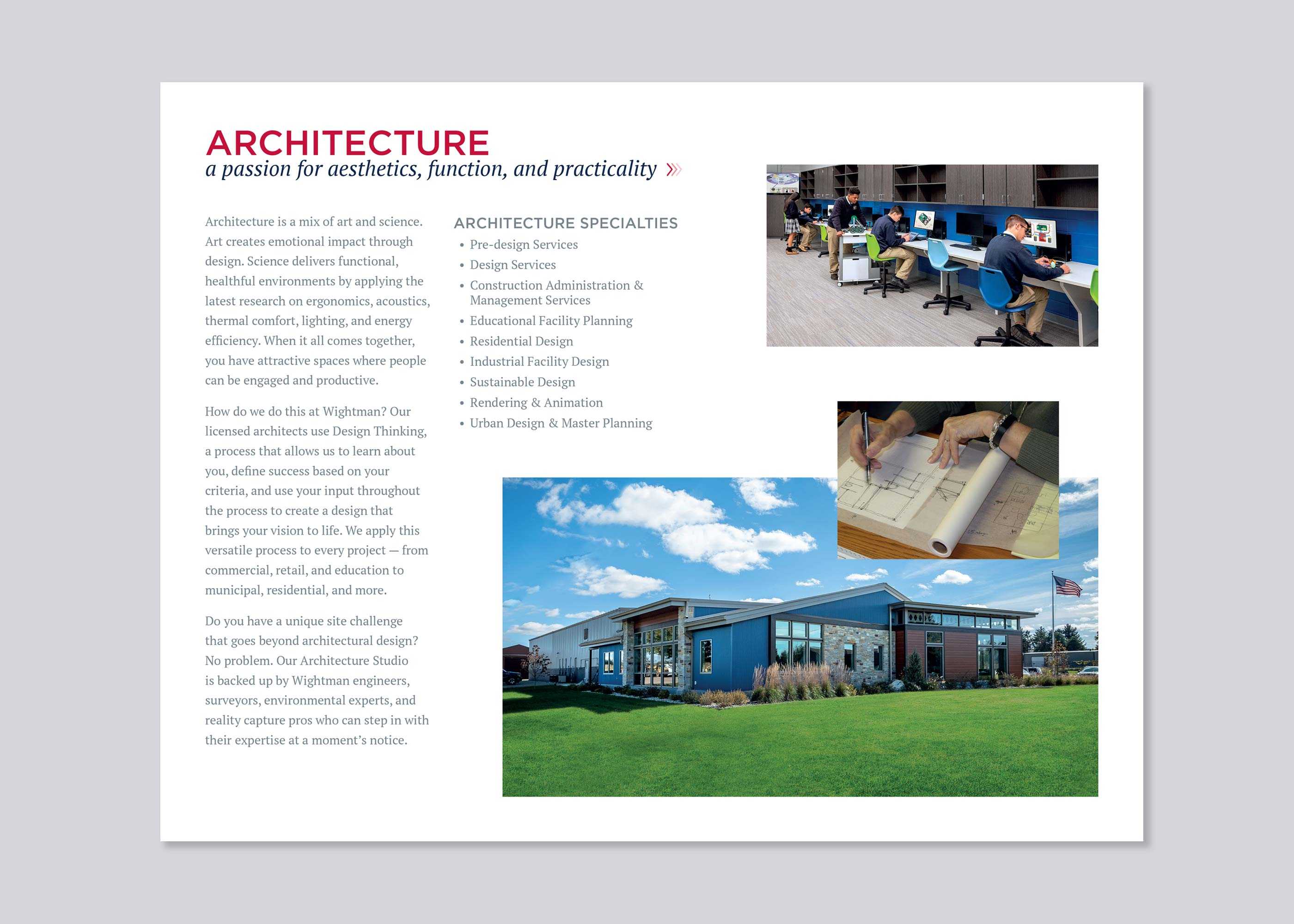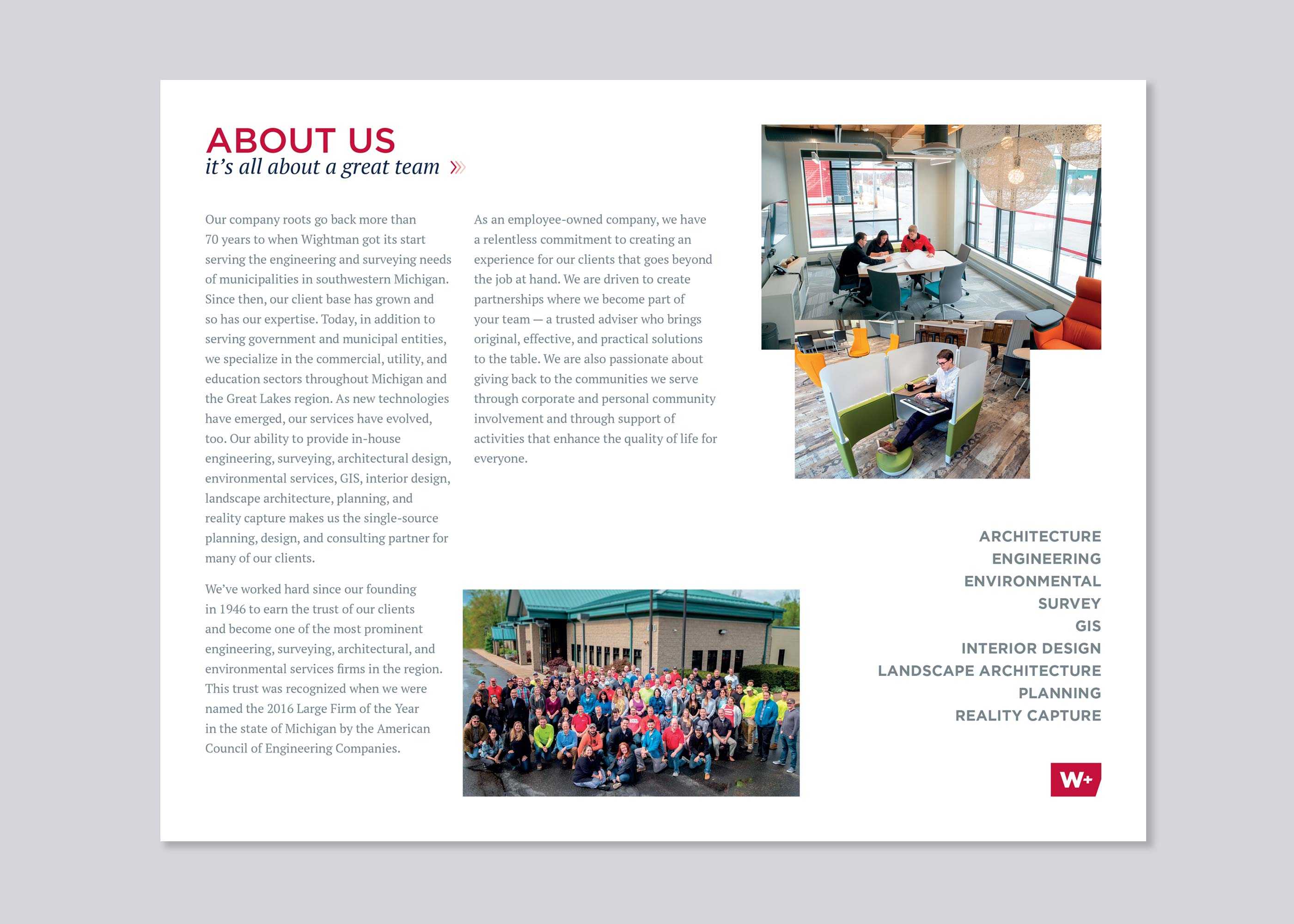 Featuring dynamic images of Wightman’s staff hard at work and project sites, the content begins with insight into Wightman’s history and culture. The focus then shifts to each of the organization’s key disciplines; Architecture, Survey, Landscape Architecture, Engineering, GIS, Planning, Environmental, Interior Design, and Reality Capture.